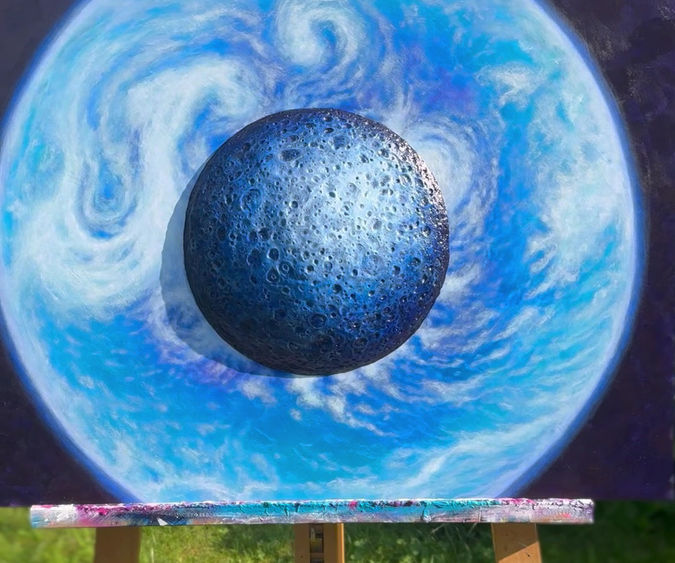 Mit „The Dark Side of the Moon“ schafft Jen Weissenbacher ein hybrides Objekt zwischen Malerei und skulpturalem Relief. Die zentrale Form – ein massiv wirkender, fast planetarischer Körper – tritt aus dem Bildgrund hervor und behauptet sich als plastische Präsenz im Raum. Seine Oberfläche, die an vulkanische Mondlandschaften erinnert, wird durch die Verwendung von Polymerton greifbar gemacht.