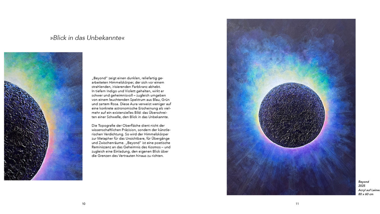 The new catalogue raisonné, "Magical Pop Realism," presents key works by Jen Weissenbacher—across the spectrum of painting, sculpture, and the cosmos. It features works from the "Zwischenräume" series, including The Watcher, Beyond, Dark Side of the Moon, and Follow the White Rabbit.