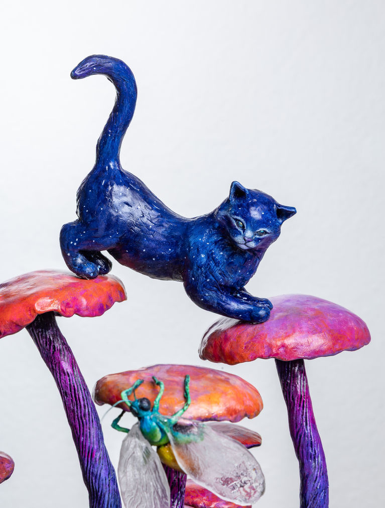 Eine nachtblau funkelnde Katze balanciert auf leuchtenden Pilzkappen und blickt einer schillernden Zikade entgegen. Die intensiven Farben – ein Zusammenspiel aus Violett, Pink und Ultramarin – verdichten die surreale Atmosphäre und lassen die Szene wie einen flüchtigen Moment aus einem Traum erscheinen.