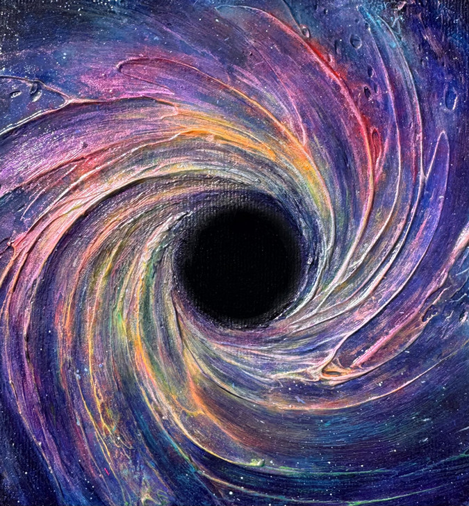 The Pull ist eine kosmische Materialstudie über Anziehungskraft und Grenzbereiche. Im Zentrum des Bildes öffnet sich ein schwarzes Loch – gemalt mit dem „schwärzesten Schwarz der Welt“. Es verschluckt das Licht, absorbiert jede Reflexion – und zieht auch den Blick unweigerlich in sich hinein.